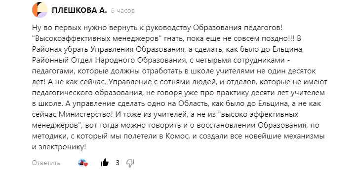 Там работало несколько бывших педагогов со стажем, которые всё знали про школу и понимали, что ей нужно. Теперь пришли эффективно-неэффективные менеджеры, которые видели школу, когда в ней учились, да и то всё забыли.