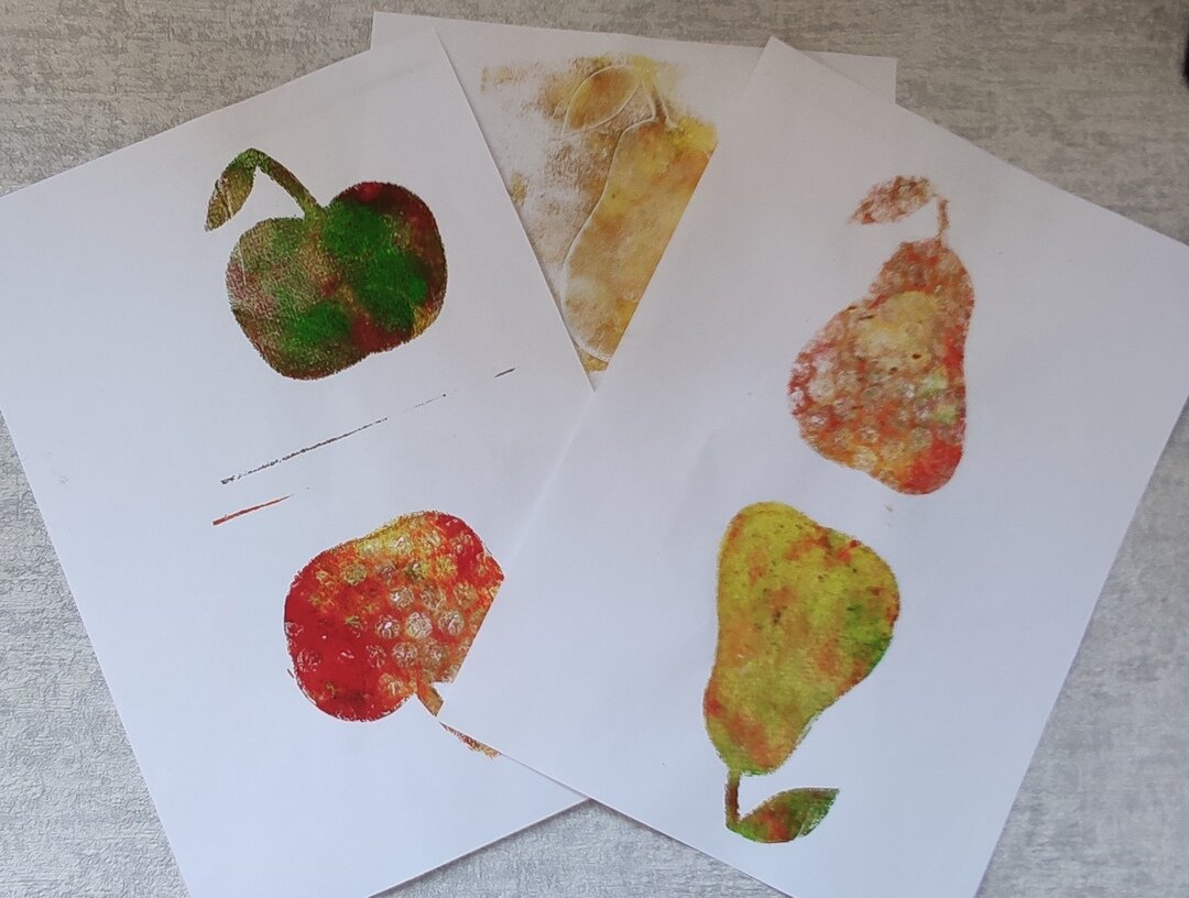 И опять гелевая пластина и маски. Яблоко и груша. Очень довольна тем, что получилось. Немного не хватает мне терпения для работы с гелевой пластиной. Для действительно многослойной работы нужно терпение, или хотя бы несколько пластин. А я тороплюсь и получается не совсем то, что хочется.