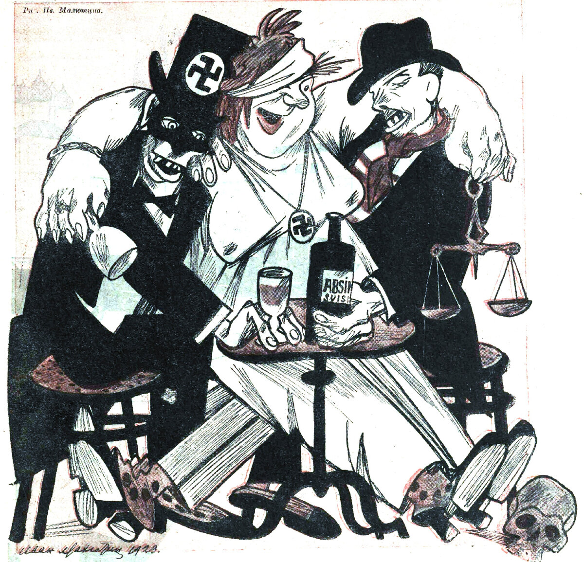 Это дело столетней давности уже прочно забыто, поэтому кому напомню, а кому и сообщу - карикатура посвящена судебному процессу в Лозанне над Морисом Конради и Аркадием Полуниным, закончившемуся оправданием подсудимых.