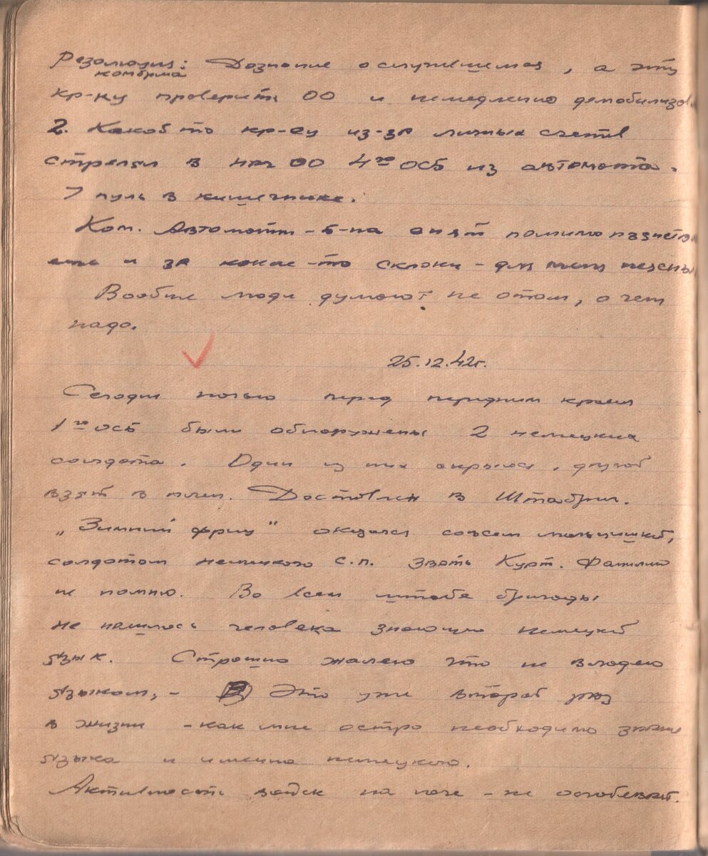 25.12.42г Сегодня ночью перед передним краем 1-го ОСБ были обнаружены 2 немецких солдата. Один из них скрылся, другой взят в плен. Дотсавлен в Штабриг. «Зимний фриц» оказался совсем мальчишкой, солдатом немецкого с.п. Звать Курт. Фамилию не помню. Во всем штабе бригады не нашлось человека знающего немецкий язык. Страшно жалею что не владею языком. Это уже второй раз в жизни как мне остро необходимо знание языка, и именно немецкого. Активность войск на юге – не ослабевает. Сегодня в сводке – новое наступление наших войск на Сев. Кавказе, от Нальчика. Все с нетерпением ждут наступления на нашем, Ленинградском фронте. Опубликован указ о медалях «За оборону Ленинграда», Сталинграда, Одессы и Севастополя. Температура упала до -3. Очень хорошо. Следующая страница 26.12.1942. Предыдущая страница Предисловие к дневнику здесь