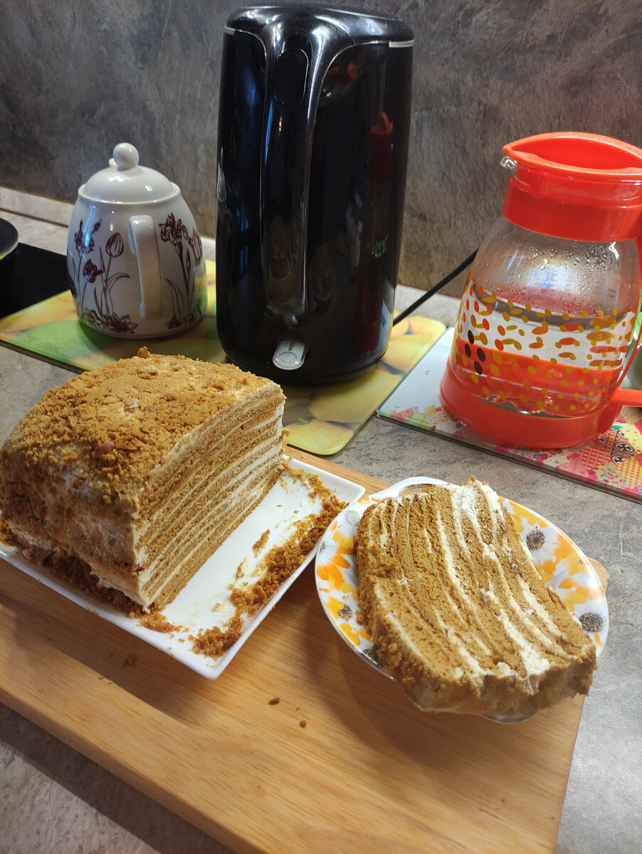 Здравствуйте читатели моего канала и добро пожаловать ко мне на кухню. Вечером позвонила супруга и сообщила, что приедет домой на следующий день с внуком. Попросила приготовить для него чего-нибудь вкусненького. Решил приготовить торт медовик. Нашел в сети рецепт простого и, пожалуй, самого быстрого приготовления этого десерта. Ингредиенты доступные, готовится просто, вкус отличный. Внук оценил очень даже положительно. Обратите внимание. Готовил в духовке на противнях с шириной 45 см. Для духового шкафа 60 см, количество продуктов указано в скобках. Ингредиенты: Основа · Мёд – 90 г (120г) · Сода пищевая – 1ч. л. (1,5 ч. л.) · Масло сливочное – 100г(150г) Тесто · Мука пшеничная – 200 г (300г) · Сахар (песок) – 100г (150г) · Яйцо куриное – 4шт.(5шт.) · Соль – 1 ч. л. (1,5 ч. л.) Крем · Сметана 20% – 600г (800г) · Сахарная пудра – 2 ст. л. (3ст.л.) · Соль – 1/2 ч. л. (1 ч. л.) Как приготовить: понадобятся противни и пергаментная бумага. Основа: