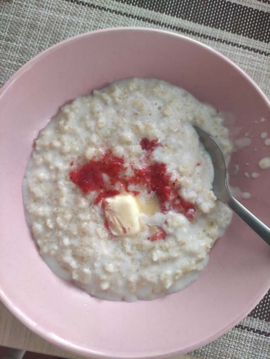 Завтрак - овсянка с клубникой перетертой с сахаром из морозилки. Раньше я не умела варить овсянку. Ну вот вроде что сложного, а не получалось. А недавно в инстаграм у кого то в сториз увидела лёгкий метод и решила попробовать. Утром, как вскипит чайник, заливаю кипятком горсть овсяных хлопьев и оставляю распариться, пока занимаюсь утренними процедурами. Минут 7 примерно постоит, заливаю молоком и ставлю на огонь. Довожу до кипения, с минуту держу и выключаю. Вот и всё. Ну конечно добавляю соль, масло, сахар или ягоды. Это оказалось очень просто и всегда вкусно. Теперь овсянка на завтрак - частый гость. Обед - суп из консервированной горбуши с плавленным сырком. Яблоки. Ужин - отварной кусочками картофель, запечённая утка, маринованные помидоры. Чай и печенье.
