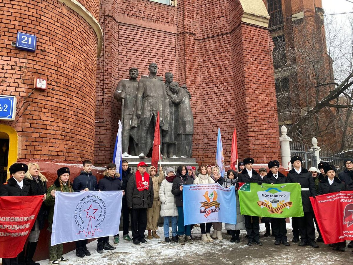Я с вами равный среди равных, Я камнем стал, но я - живу. И вы, принявшие Москву В наследство от сограждан ратных, Вы, подарившие века мне, Вы - все, кто будет после нас, Не забывайте ни на час, Что я смотрю на вас из камня. Марк Максимов В годы Великой Отечественной войны сотни тысяч добровольцев защищали Москву от наступления врага. Сегодня о подвиге обычных жителей Москвы напоминают мемориальные доски, скульптуры и стелы, установленные по всей столице. 10 декабря 2022 года в составе группы Фонда сохранения исторической памяти и поддержки патриотических инициатив МИР РАДИ ЖИЗНИ обучающиеся и преподаватели гуманитарно-правового колледжа почтили память тех, кто летом страшного 1941 года ушел добровольцем в Московское народное ополчение. Обучающиеся и преподаватели возложили цветы к Вечному огню и поклонились Могиле Неизвестного Солдата. Почтили память работников Московского электролампового завода, преимущественно из которых 2 июля 1941 была сформирована 2-я дивизия народного ополчения