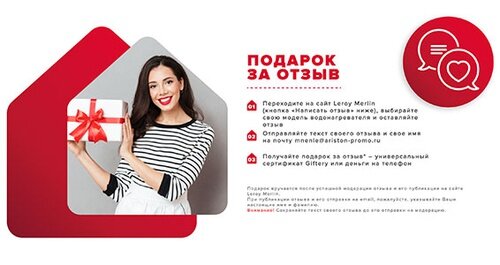 Подробнее https://reklamnyeigry.ru/2022/12/26/%d0%bf%d0%be%d0%b4%d0%b0%d1%80%d0%be%d0%ba-%d0%b7%d0%b0-%d0%be%d1%82%d0%b7%d1%8b%d0%b2/ Чтобы принять участие в рекламной акции Подарок за отзыв необходимо с 01 января 2022 года по 30 января 2023 года: 1. Переходите на сайт Leroy Merlin https://ariston-promo.ru/mnenie-lm/, выбирайте свою модель водонагревателя и оставляйте отзыв; 2. Отправляйте текст своего отзыва и свое имя на почту mnenie@ariston-promo.ru; 3. Получайте подарок за отзыв – универсальный сертификат Giftery или деньги на телефон. Подарок вручается после успешной модерации отзыва и его публикации на сайте Leroy Merlin.