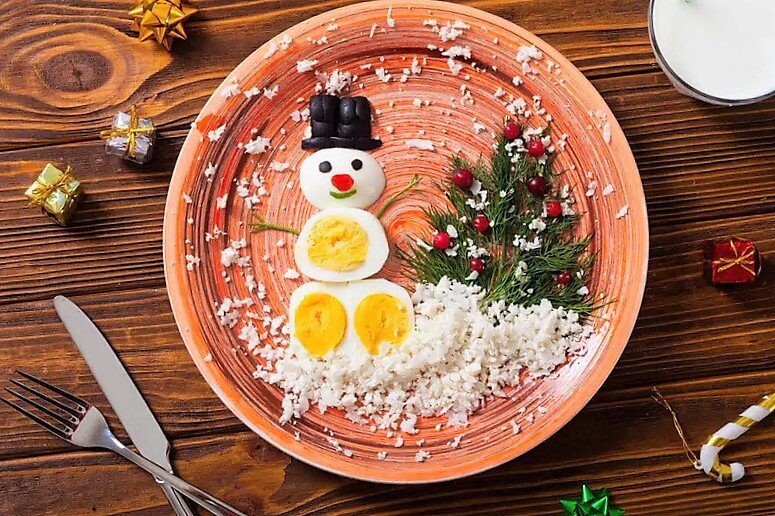 Быстрый новогодний завтрак из яиц, который выглядит великолепно и имеет прекрасный вкус. Снеговик из сваренных вкрутую яиц быстро готовится и порадует как детей, так и взрослых. Ингредиенты ниже, в комментариях. Время приготовления: 15 мин. Пошаговый рецепт: Новогодний завтрак в виде снеговика: ШАГ 1: Разрежьте 2 яйца. Выложите снеговика из нарезанных яиц на тарелке. ШАГ 2: Достаньте желтки из оставшихся яиц. Яичный белок мелко натрите на терке. ШАГ 3: Выложите яичный белок на тарелку в виде снега. ШАГ 4: Из маслин вырежьте шапку снеговика. ШАГ 5: Рядом со снеговиком разложите укроп в форме елочки. ШАГ 6: Украсьте клюквой и подавайте в качестве новогоднего завтрака. Приятного аппетита и прекрасного настроения! Друзья, ставьте лайк👍 и подписывайтесь на канал😍, чтобы не пропустить новые рецепты!