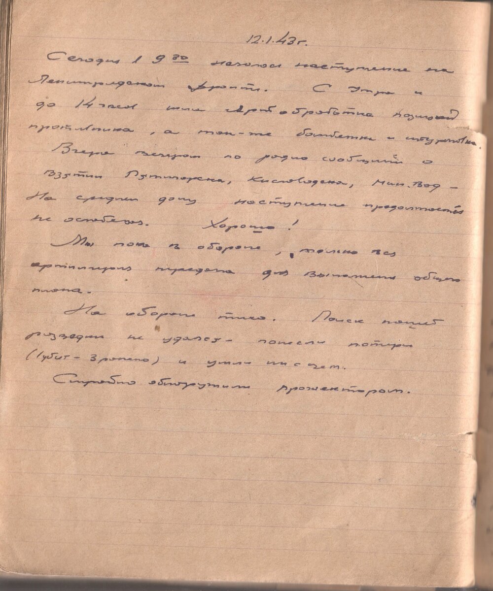 12.1.43г. Сегодня в 9-30 началось наступление на Ленинградском фронте. С утра и до 14 часов шла Артобработка позиций противника, а также бомбежка и штурмовка (не понял… прим СВ). Вчера вечером сообщили о взятии Пятигорска, Кисловодска, Мин. вод. На среднем дону наступление продолжается не ослабевая. Хорошо! Мы пока в обороне, только вся артиллерия передана для выполнения общего плана. На обороне тихо. Поиск нашей разведки не удался – понесли потери (1 убит, 3 ранено) и ушли ни с чем. Случайно обнаружили прожектором. Следующая страница 13.01.1943. Предыдущая страница Предисловие к дневнику здесь