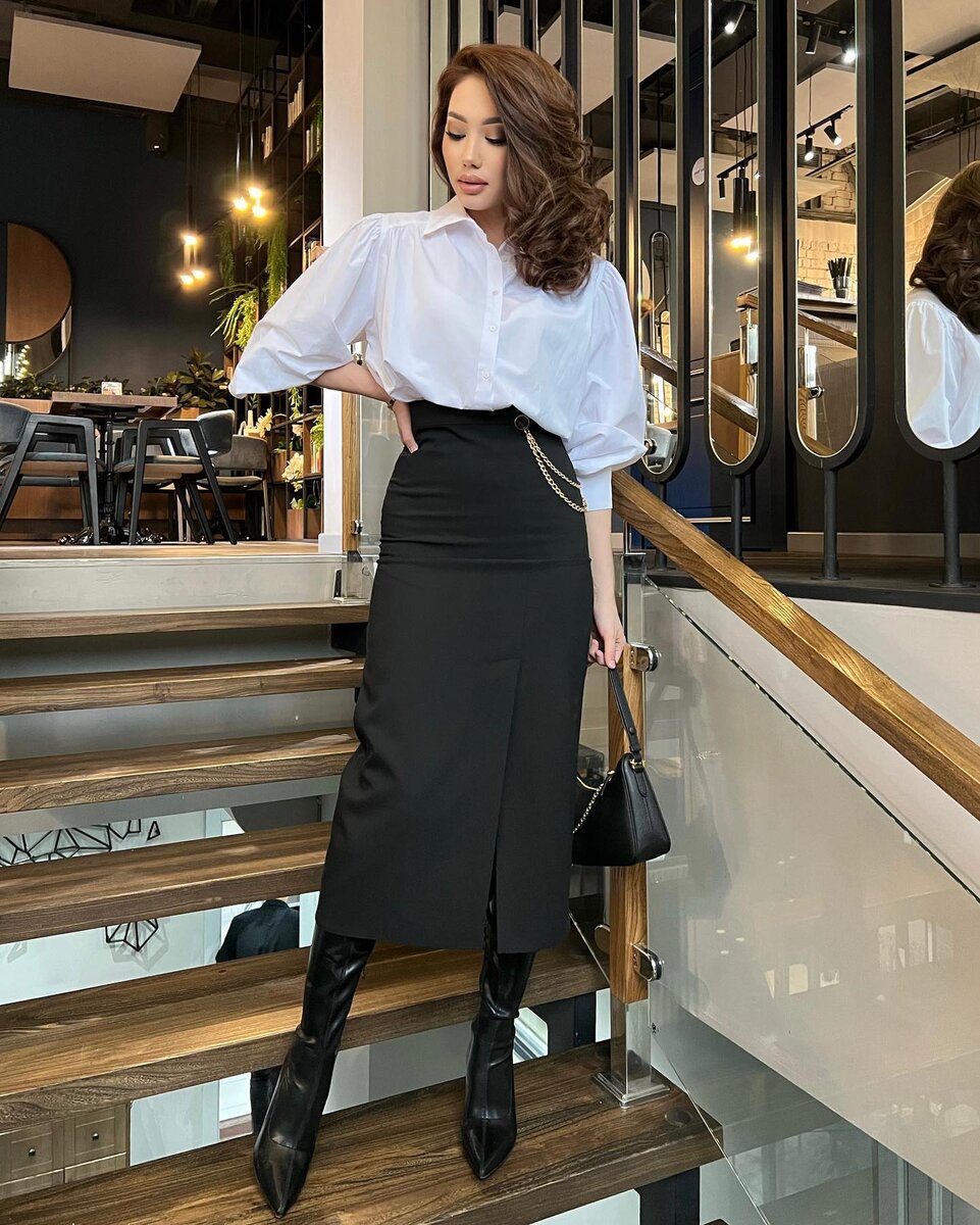 Юбка длины миди – незаменимый элемент офисного гардероба. Что касается фасонов, здесь почти никаких ограничений, зато есть огромный выбор изысканных и нескучных сочетаний с этой вещью. Ниже 10 готовых комплектов с юбкой миди для вашего вдохновения! Дуэт белоснежной блузки и юбки-карандаш идеально вписывается в атмосферу важных переговоров и деловых встреч. В холодное время года образ стоит завершить высокими кожаными сапогами. Одежда с принтом не идет в разрез с устоявшимися нормами и правилами офисного стиля. Так, клетчатая юбка отлично ладит с бежевым свитером, зимними сапогами. Самым смелым выбором для работы может стать юбка с узнаваемым змеиным рисунком. Такая модель не нуждается в вычурных дополнениях, ее достаточно соединить с базовой водолазкой, замшевыми сапогами и пальто классического кроя. Не хуже юбка миди смотрится в составе костюма. Также ее можно носить без жакета с освежающей водолазкой, зимней обувью с тиснением. В деловом гардеробе всегда найдется место твидовому к