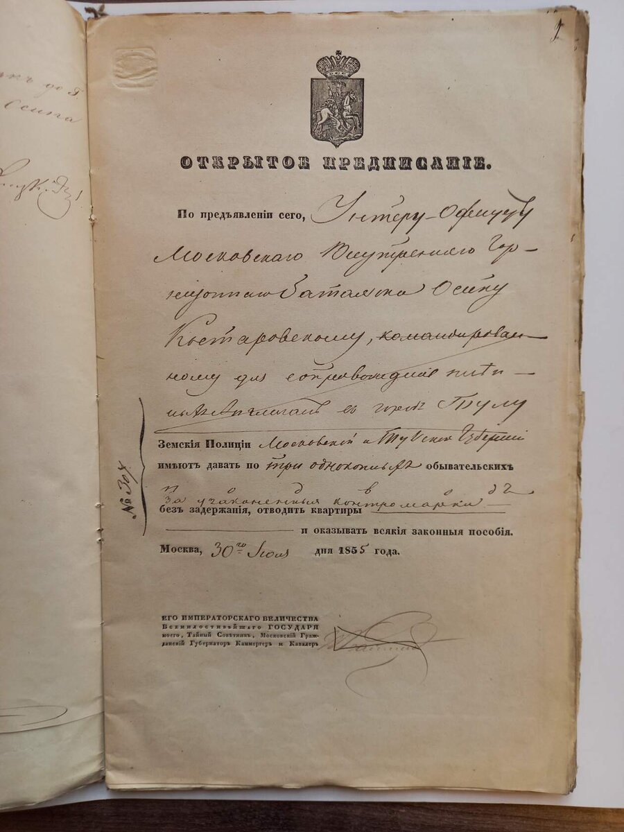 Так, 30-го июля того же 1855 года Рязанский Гражданский Губернатор П. П. Новосильцев сообщал своему московскому коллеге И. В. Капнисту о желании поскорее отправить из Рязани в Одессу через Москву английских офицеров: