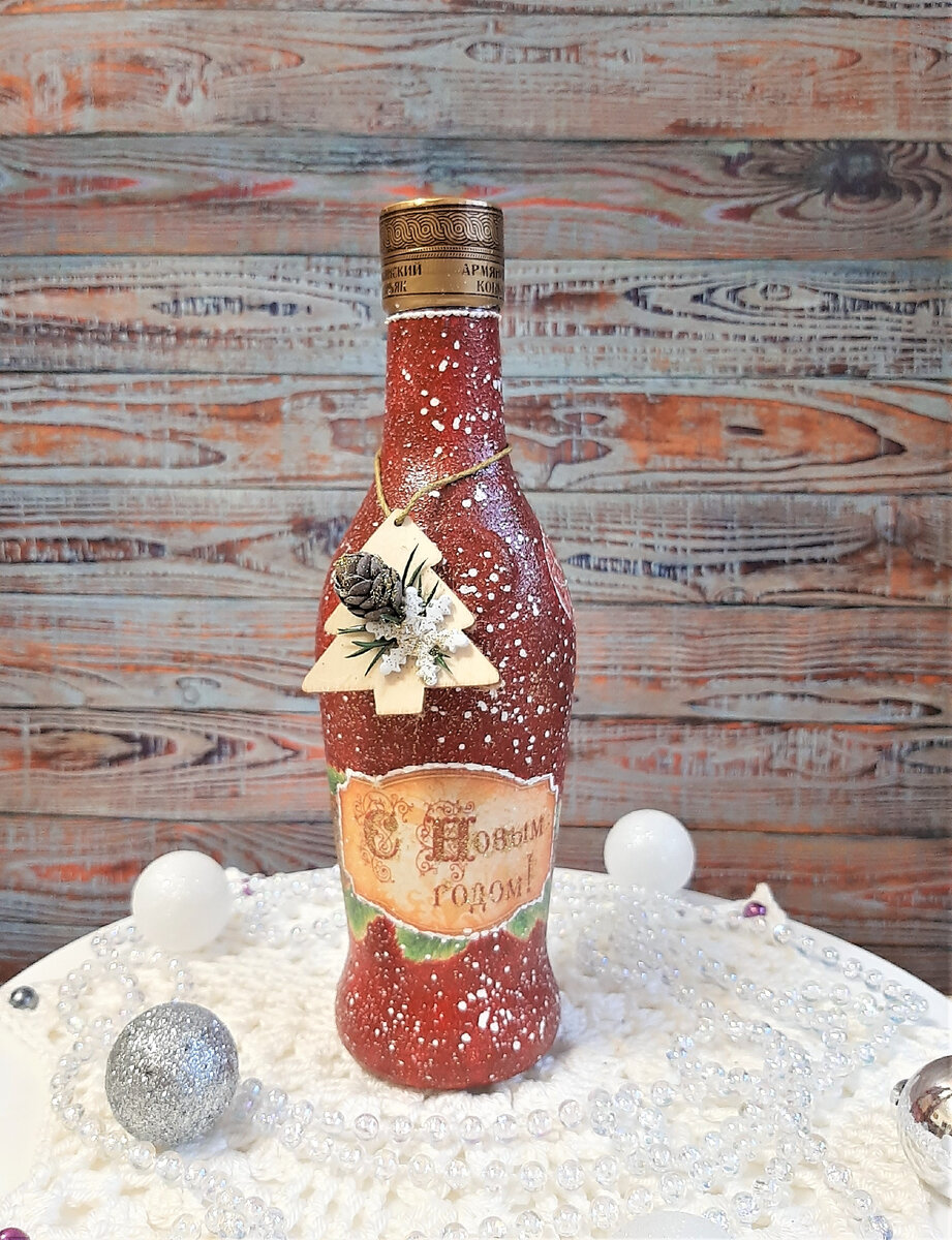 Сегодня предлагаю украсить бутылочку коньяка. Она маленькая, поэтому с декором сильно не размахнешься. Основной акцент решено было сделать на съемную подвеску. Смотрим))) В работе нужны: Бутылка, декупажные салфетка и карта, акриловый лак, акриловые краски, клей ПВА, глиттер, контуры, декоративные элементы. Основу готовим стандартно — очищаем от всех этикеток бутылку и покрываем 2-3 слоя белой акриловой краской: Для украшения будем использовать вот такие мотивы: С надписью клеим на переднюю часть: Заднюю закрываем салфеткой: Смешиваем красную краску и немного синей для получения бордового оттенка. Полученным цветом окрашиваем всю бутылочку и делаем набрызг белой краской: Белым контуром выделяем ободок под крышкой и границы надписи: Тем же контуром слегка проходим по изображениям игрушек: Покрываем несколькими слоями акрилового лака. Пока бутылочка сохнет, приступим к сборке подвески. На основу-ёлочку горячим клеем сажаем шишку (МК по её созданию можно посмотреть здесь - https://dzen.ru