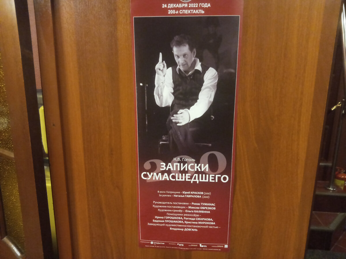 Всем добрый день. Сегодня расскажу про наш поход в театр имени Евгения Вахтангова - студия молодых артистов - спектакль "Записки сумасшедшего". Вчера был мини юбилей данного спектакля - 200 раз он был поставлен на этой сцене!!! Первое, на что стоит обратить внимание - если это студия - адрес пишется на билете мелко, сбоку от основного адреса театра. Изначально мы пришли по основному адресу и нас любезно проводил сотрудник службы охраны до студии. Не факт, что мы бы быстро ее смогли найти. Указателей нет, необходимо пройти от самого театра примерно два дома вперёд, повернуть налево и пройти дом. Там будет за металлическим забором красная вывеска, чтобы зайти - необходимо нажать кнопку домофона. Затем уже двери открывают полностью и не закрывают. Мини квест. В этом помещении я никогда не была. Итак - зашли внутрь, достаточно узко. Небольшая гардеробная, рядом уборная на одного человека с душем))) даже сделала видео фиксацию. Затем небольшой буфет, после него кухня!!! И ещё один ту