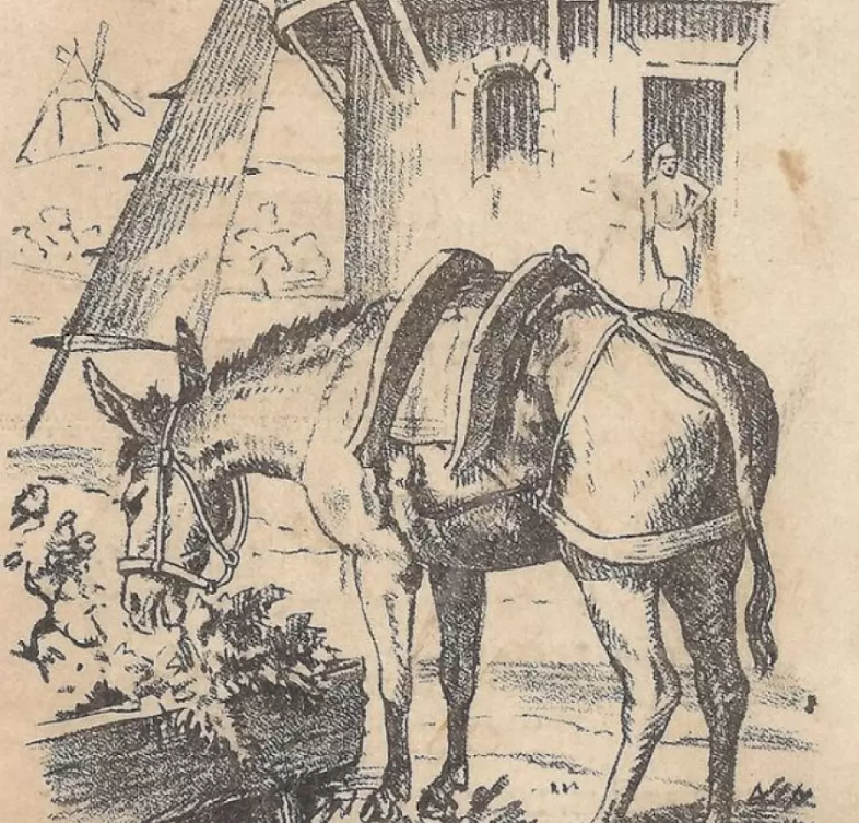 На картинке изображена мельница с ее хозяином-мельником, стоящим в дверях, а на переднем плане отдыхает осел, неспешно поедающий траву. Единственное, кого не хватает на изображении – хозяина осла.
