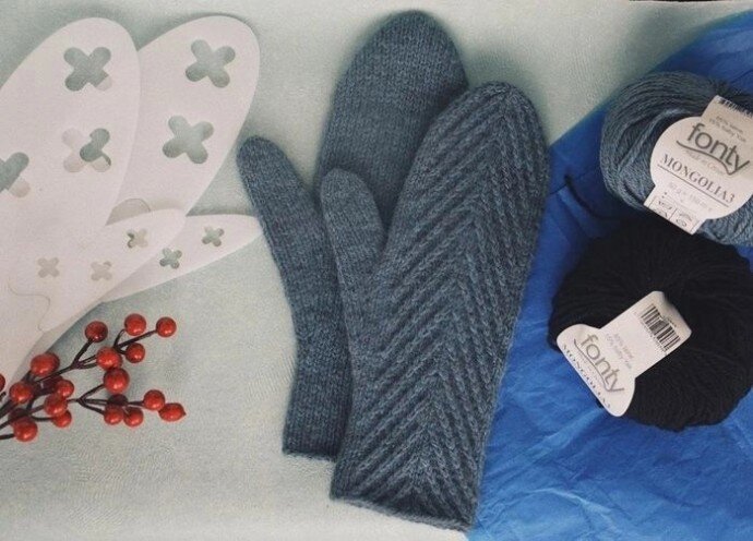 Варежки с анатомическим пальцем, связанные узором из параллельных линий
