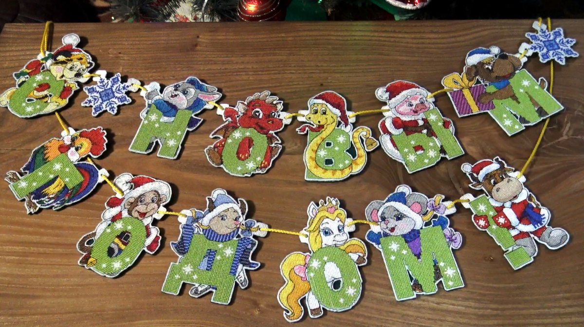 Еще одна моя давняя задумка воплотилась в жизнь. По картинкам с просторов интернета я сделала схему вышивки в программе Pattern Maker Pro+ME и перевела ее в машинный формат. Гирлянда вышита машинным крестиком. Процесс трудоемкий, но очень интересный. Сначала запяливается плотный стабилизатор в пяльца, а затем закрепляющей строчкой пришиваем фетр. Я для вышивки крестиком использую только белый фетр, потому что крестик просвечивает основу, если вы возьмете цветной, то его будет очень даже видно. Дальше идет вышивка, с отключением обрезки нитки. Протяжки обрезаем ручками, после смены ниток каждого цвета. Когда все звери вышиты, можно немножко поиграть в слова))) Затем на изнаночную сторону при помощи клеевой паутинки я наклеила еще слой фетра (можно купить клеевой фетр и паутинка не понадобится), вырезала и аккуратно выжигателем прошла краешки, сделала дырочки для веревочки. Дальше остается только продеть веревочку и найти место, где ее подвесить. С наступающим Новым годом! Счастья, здо