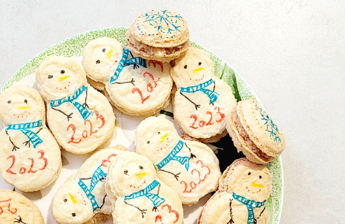 13. Выкладываем снеговиков парочками (по размеру). На одну половинку распределяем начинку и накрываем второй половинкой.
