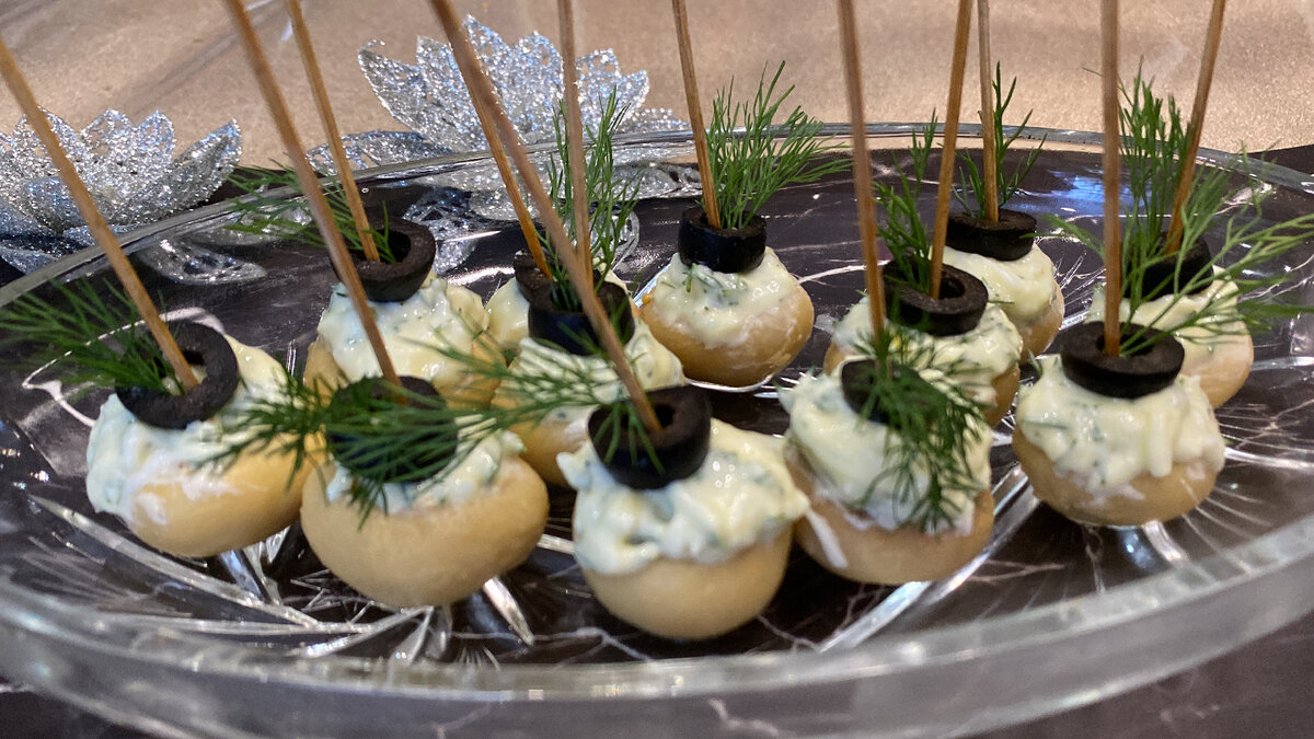 шпажки для нанизывания Вареное куриное яйцо трем на мелкой терке, в него добавляем плавленный сливочный сыр и все хорошо перемешиваем. Нарезаем мелко зелень укропа и добавляем туда же. У маринованных грибов удаляем ножки и получившейся начинкой заполняем шляпки грибов. Нарезаем маслины на колечки и с помощью шпажки нанизываем ее и вставляем в фаршированную шляпку шампиньона. Украшаем каждый гриб веточками укропа и таким образом у нас получается красивая зимняя закуска на празднич