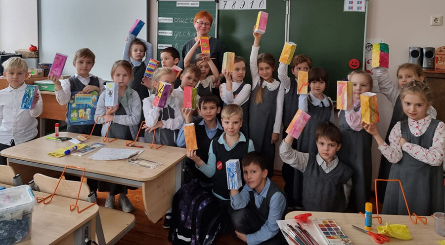 С первоклашками мы читали мою книжку «Всё до лампочки! История света», рассматривали настоящую керосиновую лампу и глиняный греческий светильник, а потом малыши своими руками смастерили чудесные фонарики и расставили их по школе. Как волшебно сияли их огоньки в утренних сумерках и сразу поднимали всем настроение!