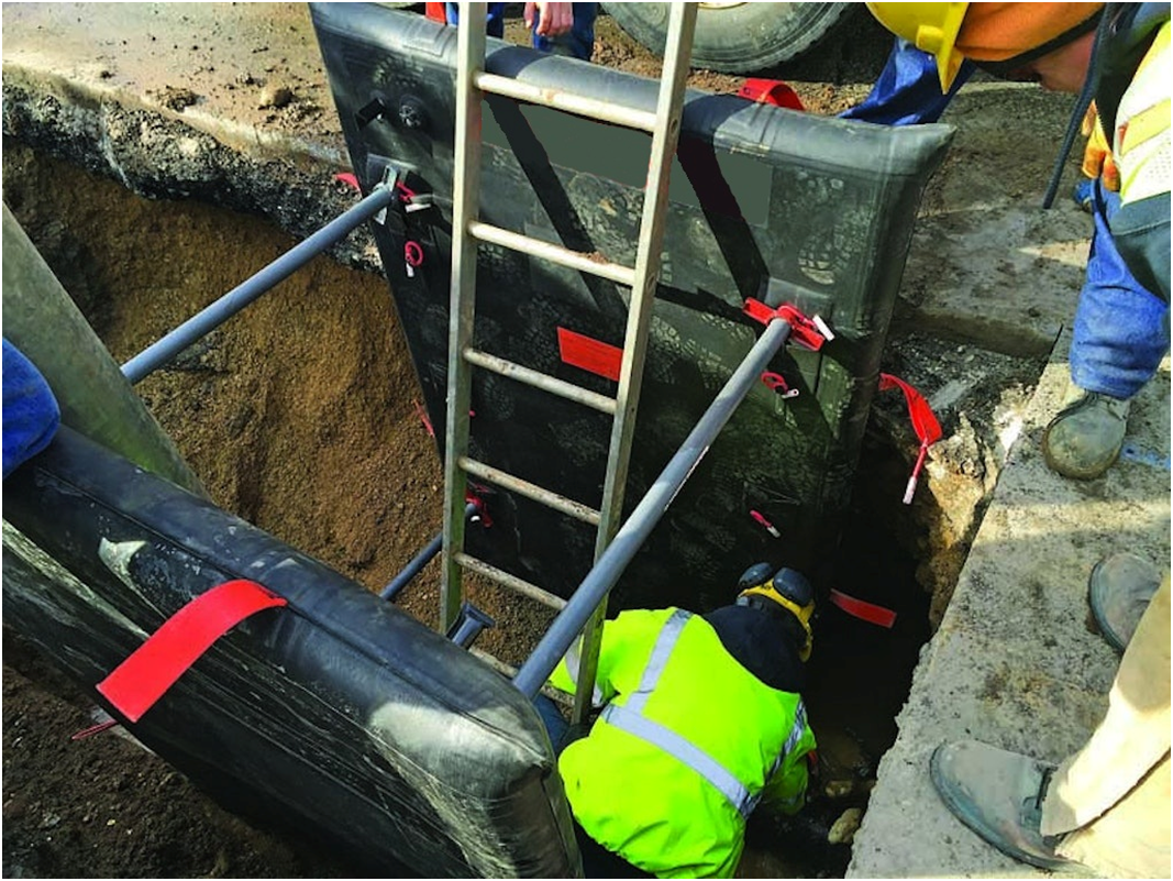 Эта система состоит из двух надувных подушек, которые после надувания удерживаются на месте металлическими или композитными распорками. Система может быть адаптирована к ширине траншеи. Эту систему можно поднимать и опускать вручную на дно траншеи, как в разборном, так и в сборном виде и для этого потребуется всего 2 человека. Модульная система позволяет составить любую конфигурацию. Каждая подушка весит примерно 16 кг, что вместе с распорками образует комплект около 50 кг. Подушки выполнены из прочного материала, который хорошо сопротивляется порезам и проколам. Подушки устойчивы к искрам от УШМ во время резки металла и всех ударов, связанных со строительными работами. Не смотря на это необходимо придерживаться здравого смысла и стараться не допускать соприкосновения подушек с острыми предметами. Это всё таки надувная конструкция, а не металлическая.