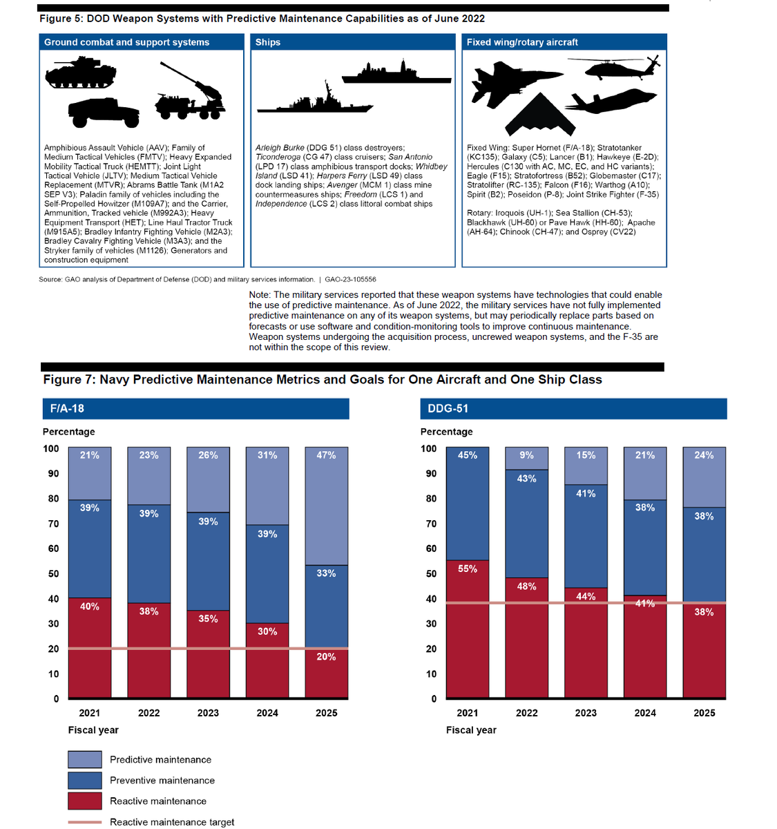 На рис. 5 показаны системы вооружений, для которых военные службы США используют некоторые ограниченные возможности прогностического обслуживания. По состоянию на июнь 2022 года военные службы не внедрили полностью прогностическое обслуживание ни на одной из своих систем вооружения, но могут периодически заменять детали на основе прогнозирования отказов или использовать инструменты мониторинга состояния для непрерывного улучшения.
