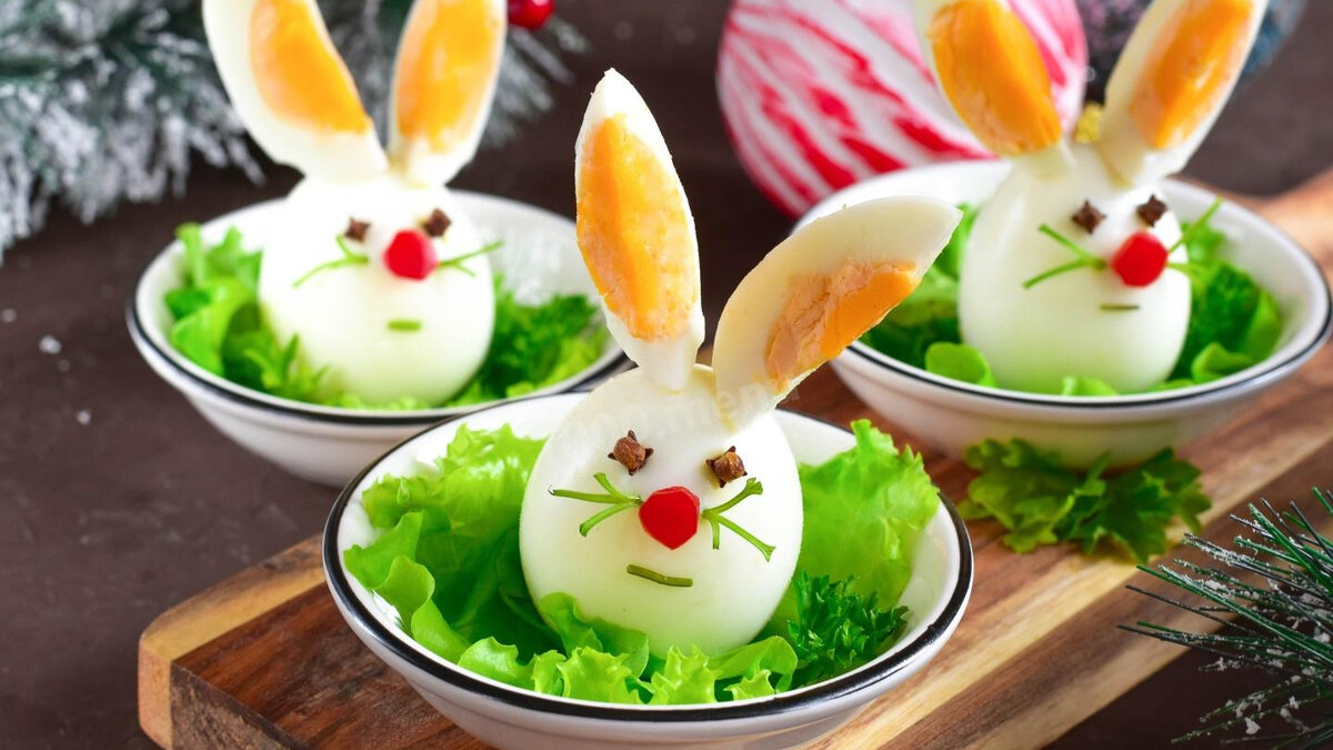 Поставьте кроликов в маленькие порционные тарелочки. Можно постелить листики салата. При необходимости для устойчивости можете срезать у яиц нижнюю часть. Подавать закуску к столу можно как самостоятельное блюдо или в качестве тематического украшения.
