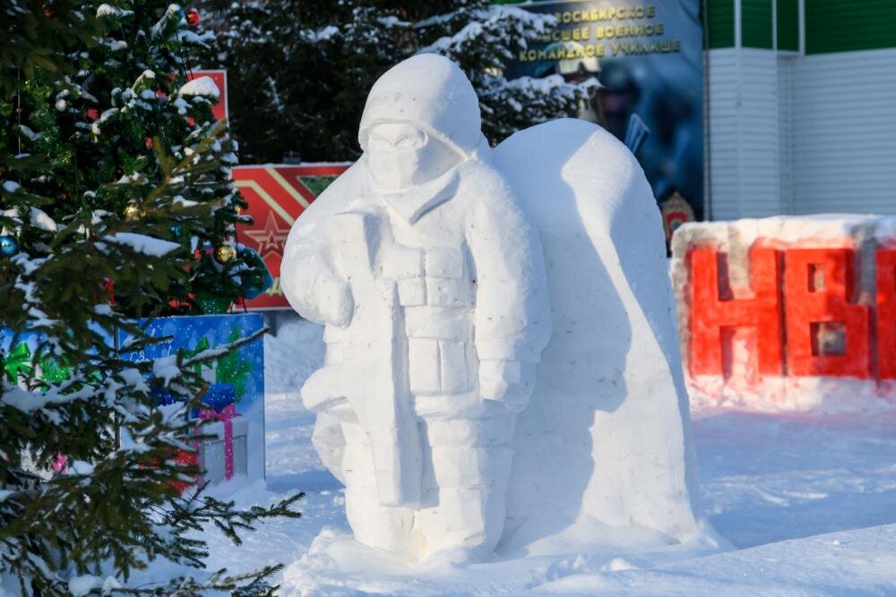 Курсанты НВВКУ, находящегося в новосибирском Академгородке, традиционно перед Новым годом украсили прилегающую территорию, пишет сайт Бердск-Онлайн. Снежные фигуры вырезаны тематические – танки, армейская символика. Но есть и символ года Зайка, сидящий на цветном Паровозике. А также одна из фигур напоминает инопланетянина. Работа еще не окончена. Не исключено, что после разукрашивания эта фигура превратится в солдата в балаклаве, натянутой на лицо. Но пока снежный человек больше похожа на инопланетянина, держащего в руках автомат. - Инопланетяне на страже Родины (надеюсь, нашей), - так охарактеризовал снежную фигурку бердский фотограф Евгений Шевердук. В Бердске, напомним, новогодние фигуры в снежном городке на площадке «Праздничная» в этом году вырезали довольно спешно из-за дефицита снега. Работы выполнили, в том числе и дети, участвовавшие в конкурсе «Юный скульптор». Духовой оркестр НВВКУ не раз выступал в Бердске в рамках акции «Спасибо врачам» - военные музыканты посвящали конце
