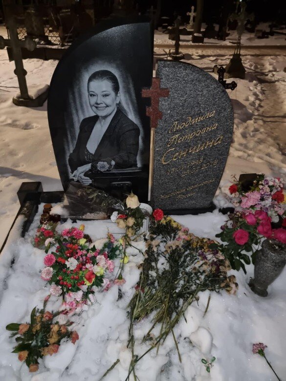 Памятник на могиле звезды был установлен лишь в ноябре 2021-го, через три года после кончины Сенчиной. Версии столь долгого отсутствия выдвигались разные – от нехватки средств на него у родственников до якобы нежелания самой Сенчиной, высказанного незадолго до ее ухода. Потом был слух, что родные решили установить на месте захоронения надгробие в виде часовни. Но им было отказано, поскольку высокий памятник мог закрыть стоящую рядом часовню Ксении Блаженной.