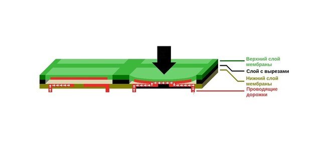 Существует несколько видов мембранных устройств: плунжерные, ножничные и обычные мембранные. У них есть небольшие отличия в реализации работы клавиш, но объединяет их наличие силиконовой подложки под кнопками. Внутренняя конструкция представляет собой слой из трех пластин. Два слоя имеют проводящие дорожки, а третий отвечает за их разделение. В местах, где находятся кнопки, разделяющая пластина имеет вырезы, что позволяет контактам соприкасаться при нажатии кнопки. Силиконовая подложка в свою очередь обеспечивает точное попадание, а ее округлая форма возвращает кнопку в исходное положение после клика. Выглядит это так: