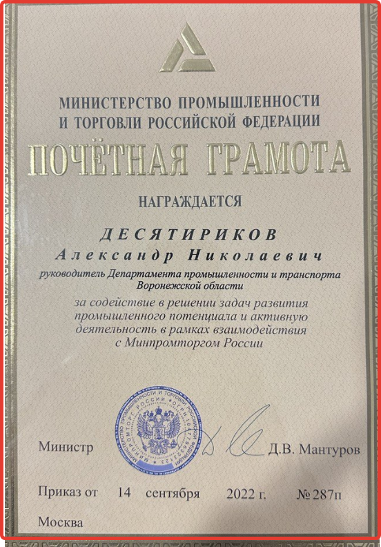 Правительственный telegram-канал «Воронежская область» в понедельник сообщил, что наш регион «получил высокую оценку за развитие промышленного потенциала». При этом местные чиновники умолчали, что почетную грамоту из рук Дениса Мантурова вручили еще 7 региональным руководителям органов исполнительной власти в сфере промышленности, в частности, из Херсонской области, ЛНР, ДНР, Чеченской республики. Руководителя департамента промышленности и транспорта Воронежской области Александра Десятирикова награда – почётная грамота от Минпромторга РФ – «нашла» в Уфе, где он в субботу принял участие в работе Координационного совета по промышленности Минпромторга РФ. В почетной грамоте Александра Десятирикова написано, что именно он (а не Воронежская область или губернатор Гусев) награждается «за содействие в решении задач развития промышленного потенциала и активную деятельность в рамках взаимодействия с Минпромторгом России». Документ Минпроторга РФ о награждении Десятирикова был подписан еще 14 с