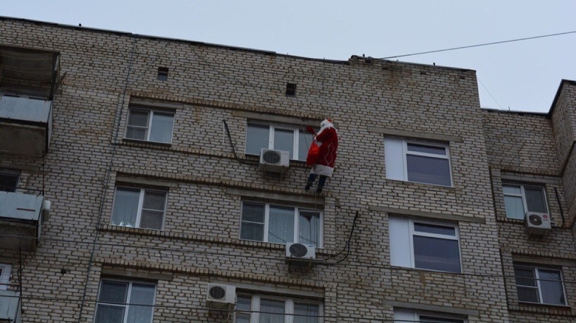 Для такого типа поздравления Деду Морозу необходимо заранее осмотреть фасад дома, чтобы понять, как безопасно спуститься к квартире.