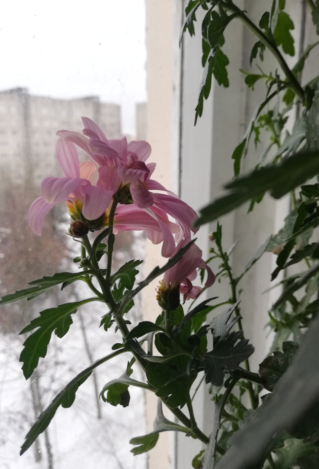 У кого к Новому году зацветает декабрист, а у меня "златоцветный" цветок - так переводится, оказывается, с древне-греческого название этого растения. Я долго ждала, когда же моя хризантема, зацветет. Но когда она наконец зацвела, я, честно говоря, не испытала большой радости. Этот цветок в горшочке, зная мою нелюбовь к покупным букетам, мне подарили на восьмое марта. Его его аккуратно пересадила в горшок побольше. Когда мне его подарили, он был невысоким маленьким кустиком. обильно покрытым красивыми фиолетовыми цветами. Однако, когда растение отцвело, то тут же благополучно засохло. Я поставила горшок на балкон, изредка поливала и внимательно следила - появятся ли новые ростки. Решила не высаживать его на клумбу. рассуждала я так - хризантема цветет поздно, когда мы бываем на даче только наездами. Пусть цветет дома. радует нас и напоминает о даче. Конечно, ростки появились, стали активно расти и я уже к осени, конечно, ждала цветов. Но куст рос в высоту, а цвести все никак не собиралс
