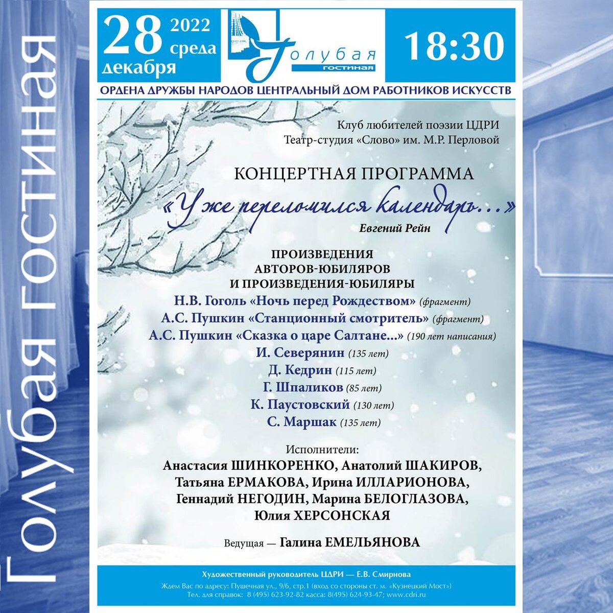 Голубая гостиная Центрального Дома работников искусств Клуб любителей поэзии ЦДРИ и Театр-студия «Слово» им. М.Р. Перловой Исполнители: Анастасия ШИНКОРЕНКО, Анатолий ШАКИРОВ, Татьяна ЕРМАКОВА, Ирина ИЛЛАРИОНОВА, Геннадий НЕГОДИН, Марина БЕЛОГЛАЗОВА, Юлия ХЕРСОНСКАЯ Ведущая – Галина ЕМЕЛЬЯНОВА КУПИТЬ БИЛЕТ ЦДРИ: г. Москва, ул. Пушечная 9/6 стр.1