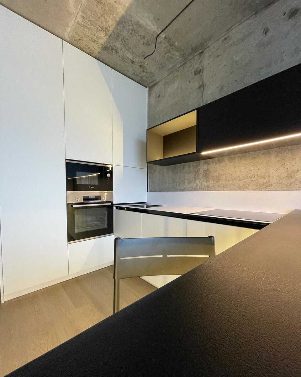 Очень интересный проект, главной концепцией которого стал естественный вид отделочных материалов и цветового решения. Кухня в стиле лофт — прекрасная идея для динамичных натур, не боящихся рисковать и живущих в ритме большого города. Подобный интерьер — настоящая кладовая самых смелых дизайнерских решений с использованием урбанистических материалов: бетона, кирпича, металла, пластика, стекла и дерева. Преобладают оттенки холодной цветовой гаммы и ахроматические цвета: белый, серый и чёрный. Одновременно простые и технологично сложные решения - удобство в ежедневной эксплуатации без потери эстетики. Ступенчатое расположение входной группы, встроенного холодильника и основной кухни визуально расширяют помещение. Интересным решением было сделать световое окно между ванной и кухней. Пролистайте карусель фотографий представленных ниже⬇️. В верхних шкафах расположена скрытая вентиляция с шумоглушителем. Установили варочную панель в одну плоскость со столешницей. Мойка нижнего монтажа из