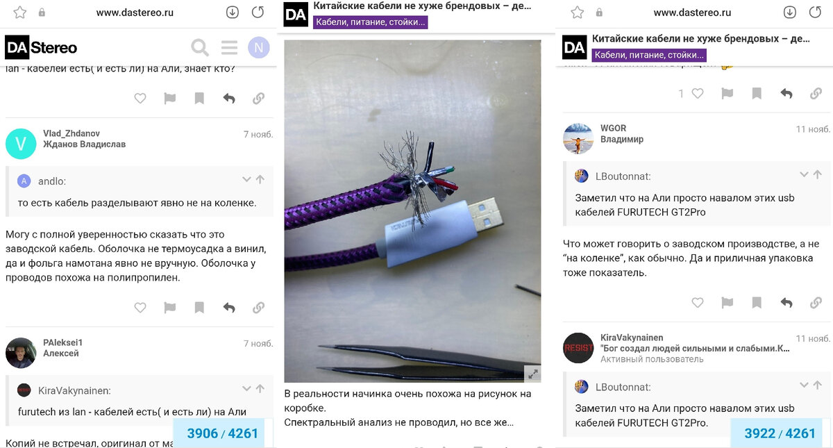 Однако червячок сомнений подгрызал, и я решил дождаться резюме от тех со-барчан, кто заказал себе кабели после нашего бурного обсуждения. Останавливало еще и то, что разбег цен даже на самом али составлял 20-25% в зависимости от поставщика. Выявилась забавная закономерность: чем ниже ценник, тем светлее цвет оплётки кабеля на фотографиях продавцов.