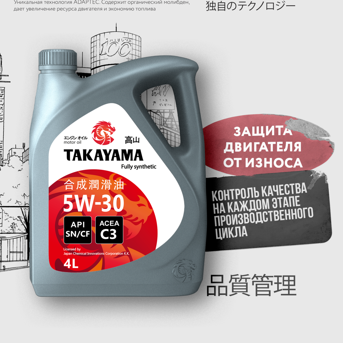 Моторные масла TAKAYAMA изготавливаются по оригинальной рецептуре, обеспечивающей максимальную защиту моторов в любых условиях эксплуатации автомобильной техники. С более полной информацией по смазочным материалам TAKAYAMA можно ознакомиться на сайте www.takayamaoil.ru или обратившись на горячую линию технической поддержки по номеру телефона 8 (800) 101-55-57.
