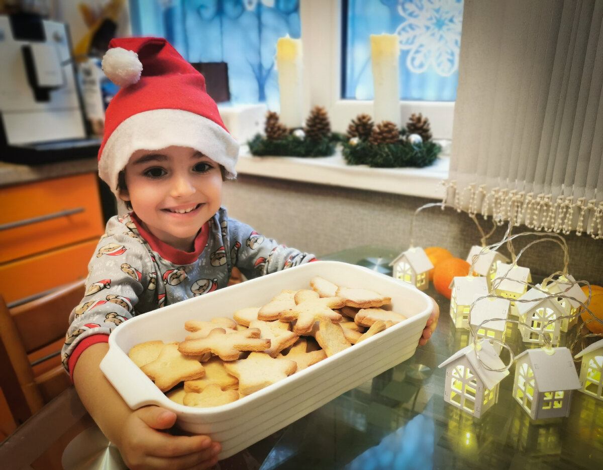 Всем привет! Расскажу о своей совсем молодой трациции, которой всего три года, но, надеюсь, что она приживется надолго. За несколько дней до Нового года мы с Димкой, моим сыночком, печем печенье. Обязательно в новогодних колпаках. Главное в процессе - то, что малыш принимает в этом максимальное участие. Конечно, в два года он просто копировал мои действия, не особо понимая их, а в этом году уже многое делает сам. А я всегда снимаю процесс на видео, а потом монтирую небольшой ролик о том, как мы пекли печенье. В этом году он будет третим по счету. Интересно же - каждый год видео про одно и то же, и можно наблюдать, как изменился ребенок за год, как с каждым годом его ручки становятся более ловкими и как все больше и больше он может сделать сам). Вот такая красота у нас напеклась. Но это еще не все! Завтра мы покроем печенье разноцветной глазурью, и оно станет нарядным. Обязательно покажу, что получилось. А потом Димка дарит эти печенюшки бабушкам и дедушкам и мы все вместе смотри