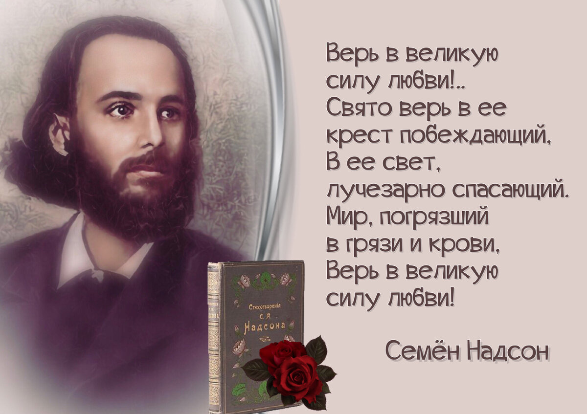 Соперник Пушкина, певец любви Семён Надсон. Конечно же, не сегодня – имя Надсона потускнело и забылось, редко кто вспомнит на память его стихи. Но сто лет назад, на стыке веков Надсон был настоящим кумиром интеллектуальной читающей молодежи. Всего девять лет пришлось на литературную деятельность поэта – много это или мало? Огромный срок, если учесть, что прожил Семён Надсон всего двадцать четыре года.