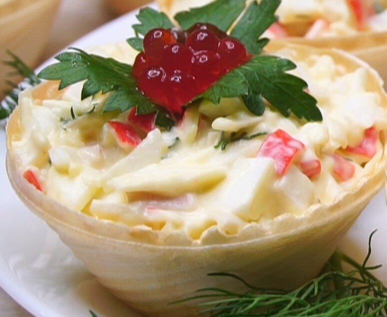 Смешать с майонезом. Поместить в корзиночки (из теста).