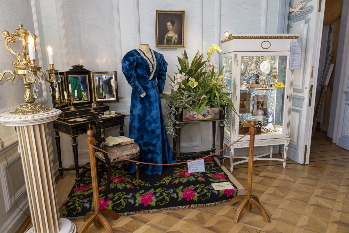 В гостиной-прихожей расположилась экспозиция, демонстрирующая элементы подготовки к празднику девушки XIX столетия. В уголке будуара хозяйки представлено визитное платье из синего бархата последней четверти XIX века, накидки-ротонды, одна из них – новое приобретение музея, образцы «туалетных» принадлежностей и украшения. В те времена к подаркам относились серьезно. Это и изящные сувениры, и роскошные сервизы, и даже вещи, которые могли пригодиться в хозяйстве. Например, представленная в витрине дамская сумочка на ручке-цепочке, также недавно пополнившая фонды музея. В уголке будуара хозяйки представлено визитное платье из синего
