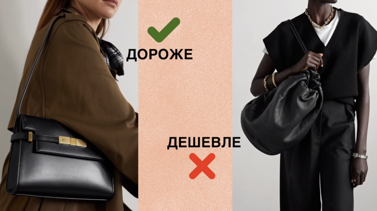 При одинаковой стоимости, вещи могут производить совершенно разное впечатление. И есть четкая схема как вы можете сделать свой образ визуально дороже. Предлагаю посмотреть на это на примере конкретных реальных вещей и обсудить основные ошибки. 1. СУМКИ Сумка, которая держит форму, всегда выглядит дороже сумки, которая не держит форму. Посмотрите, насколько более собранно смотрятся структурированные сумки. Зрительно они собирают вам образ. На большинстве важных мероприятий они будут уместны и будут работать на ваш имидж. Обратите внимание, что такая плетеная сумка тоже проигрывает по статуности структурированной сумке. С модными сейчас огромными сумками мешками или баулами будет сложно составить дорогой образ. И это не значит, что сумки плохие или некрасивые. Они подойдут для повседневности, но не для дорогих образов, когда ваша цель – произвести впечатление. 2 ПАЛЬТО Пальто с акцентированными плечами и прямым силуэтом выглядит дороже чем пальто-халат. Вот два, казалось бы, похожих че