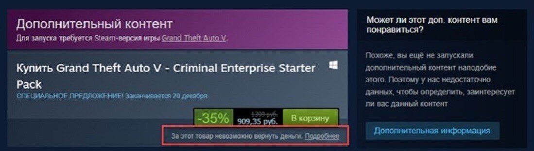 Дополнения. Эти же требования распространяются и на дополнения, но некоторые DLC вернуть не получится. Такой контент сразу помечен в Steam.