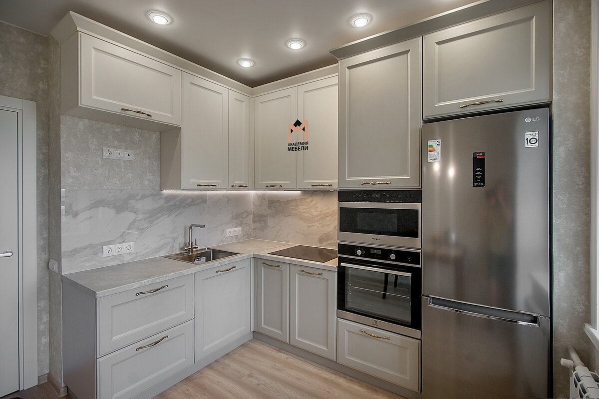 В неоклассическом стиле предусматривается использование спокойных пастельных оттенков, придающих помещению «воздушность». Поэтому материалы, выбранные для её изготовления, отличает изящество и практичность: для корпуса выбран ЛДСП Egger в оттенке "Кашемир серый". Фасады – из МДФ ВХЦ оттенков "Софт светлый" и "Софт Саванна". В таком сочетании полутонов мебель выглядит легко и изящно, визуально расширяя пространство и добавляя интерьеру легкости и света. Украшает фасады фрезеровка "Милан" и элегантные ручки – обязательный элемент неоклассики. Удачно дополняет гарнитур влагостойкая и износостойкая столешница Slotex в едином со стеновой панелью декоре "Мрамор серебристый".