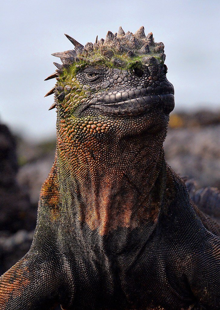 Конечно вы скажите, что на самом деле прообраз Годзиллы это стегозавр, травоядный динозавр, живший 155—145 млн лет назад. Но повнимательней присмотритесь к игуане, это же мини версия всех несчастно вымерших доисторических зверюшек! Фактов про морскую игуану великое множество, речь пойдёт не только про имидж. Начать хотя бы с того, что она морская. Единственные ящерицы приспособившиеся жить в море, не возле моря, а постоянно проводить время под водой, да ещё и в солёной. *Про аксолотль потом поговорим, дайте с игуаной разобраться. Зачем же теплолюбивой игуане пришлось научится по долгу нырять в холодную воду? Она там пасётся, буквально! Основной корм игуан - водоросли, в изобилии произрастающие на подводных камнях у берегов архипелага. Приятное разнообразие в меню вносит рыба, если игуане удается ее поймать или красный краб. Только когда температура тела ящерицы поднимется до 35°С, она сможет переварить съеденный корм и нырнуть в воду за очередной порцией. Перегрев морской игуане не гро