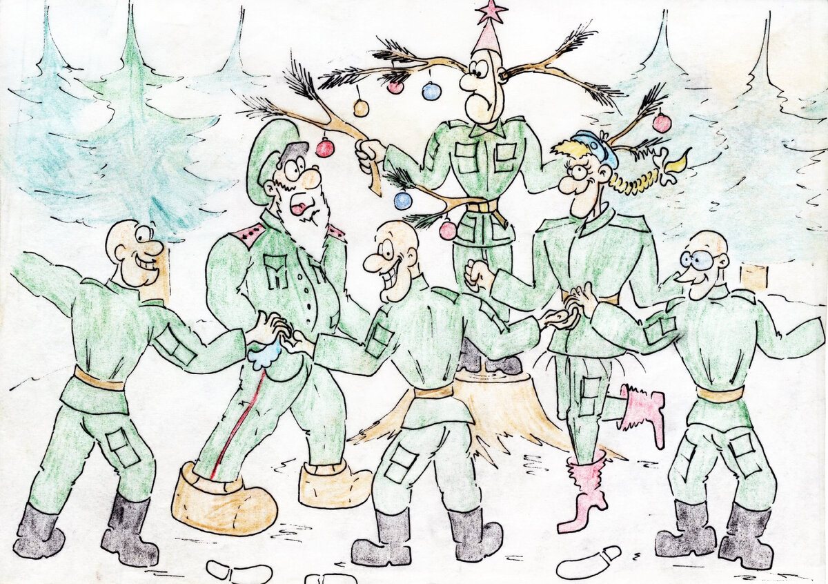 После фейерверка мы опять в столовую — пить чай с тортом. Я сидел за столом со старшим периодом. Все неспешно разговаривали о том, как быстро бежит время, пили чай, вспоминали как встречали прошлый Новый Год. Командир всем приказал не пить спиртного и уехал домой. Замполит включил креатив и всем приказал танцевать! Старшина снимал все на видеокамеру и фотографировал для истории. Почти в час ночи мыв все пошли спать.