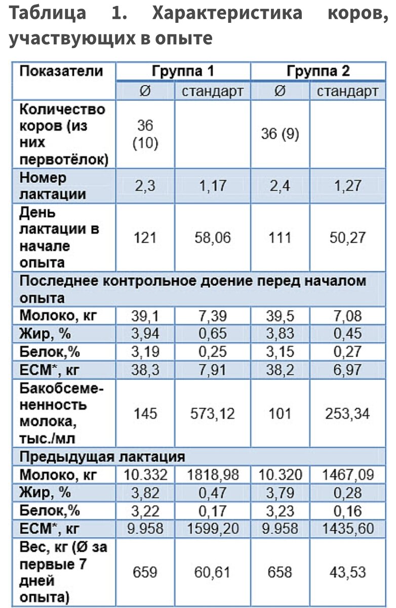 Основой служил полносмешанный рацион на основе силоса, который для опытной группы 1 (таблица 1) был составлен по рекомендациям общества по кормлению (GfE), и он оставался одинаковым на протяжении всего срока проведения опыта. Соотношение основного корма к концентрированным кормам было 60:40%.