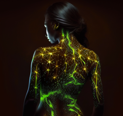 Эш повернулась, стараясь быть плавной. По её рукам и ногам змеились полосы флуоресцентной краски, позволяя видеть каждое движение. Линии на теле подчёркивали изгибы, маняще закручивались на бёдрах, обтекали грудь. На рёбрах с правой стороны были рассыпаны маленькие сумрачные звёздочки, едва выделяющиеся на тёмной карамельной коже. На левой ключице расцвёл дивный розовый цветок.