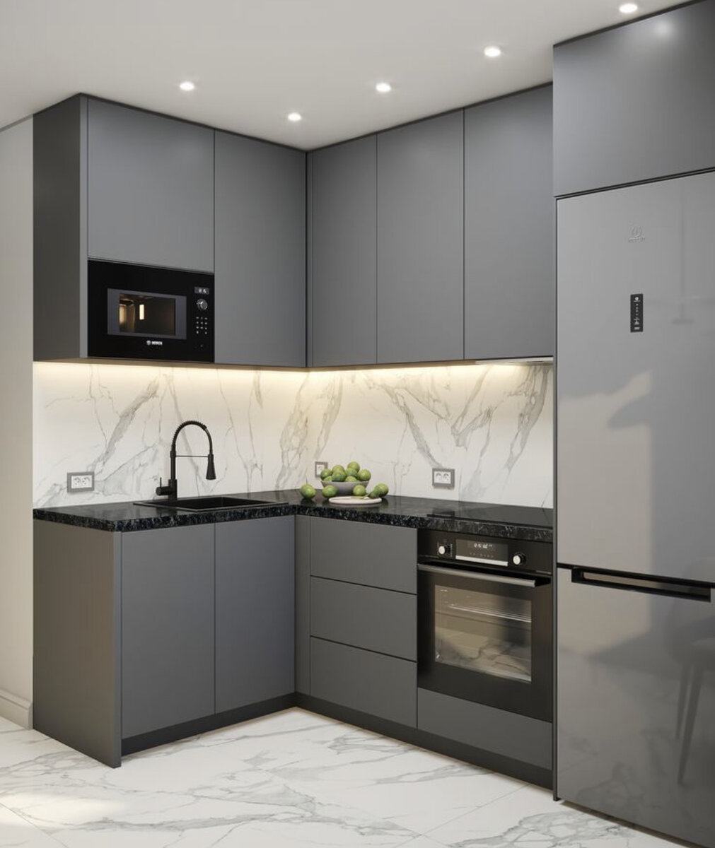 Вот такую стильную кухню под заказ мы создали для нашего клиента в г. Красногорск. Что примечательно - эта кухня сделана полностью из импортных материалов: фасады, фурнитура и корпуса - австрийские; столешница - итальянская, а стоимость её - немного больше ста тысяч рублей! Не верите? Смотрите внимательно изображение ниже, а далее - перечень материалов и фурнитуры (все позиции указаны с названиями, можно, смело загуглить ;-) Материалы и Фурнитура данной бюджетной и стильной кухни Корпус и фасады: ЛДСП Egger 16 мм в декоре серый диамант