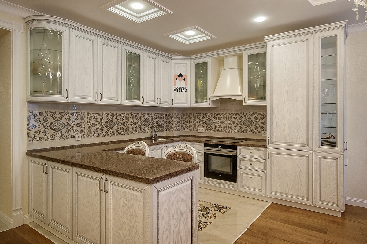 Размеры этой угловой кухни с полуостровом – 3050*2810*2020 мм. В неё органично вплетены как современное наполнение, так и изящные модули. Восхищают вставки из стекла и роскошная витрина. Отдельная тема – элегантный керамический фартук с интересным дизайнерским принтом, перекликающимся в плитке, выстилающей пол в рабочей зоне.