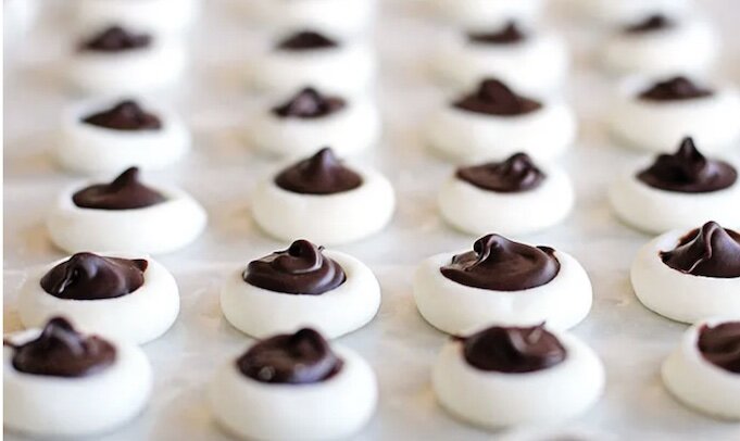 Из сливочной массы скатайте шарики размером с чайную ложку и положите на противень, застеленный пергаментом. Пальцем или круглой мерной ложечкой на 0,25 чайной ложки сделайте в шариках небольшие углубления.