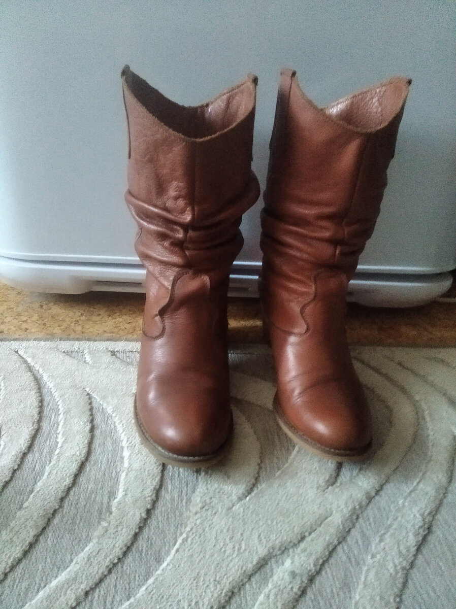 Вот и приближается Новый год! Ожидание этого праздника всегда связано еще с детства с подарками от "Деда Мороза". Вот и я решила сделать себе подарок. После двух последних работ, связанных с использованием остатков от джинсовых работ (изготовлением двух сумок), захотелось заняться чем-то полегче. Что я и сделала с большим удовольствием. Вот такую пару сапог мне отдала знакомая. Там небольшие проблемы с подошвой (она уже не носит их). Что мне понравилось в них для переделки-это как оформлен верхний край. Нет замка и внутри также отделано кожей, т.е. не надо ничего придумывать для отделки края. Основная проблема-отпороть верх сапог от подошвы и пришить дно, так как я решила использовать эти сапоги по линии наименьшего сопротивления (не резать на кусочки, хотя кожа здесь хорошего качества), а сделать типа вазы или емкости для хранения. Отрезать верх от подошвы можно любым острым ножом (даже канцелярским). Потом я провела линию по кругу, используя гибкую линейку, и отрезала излишки кожи.