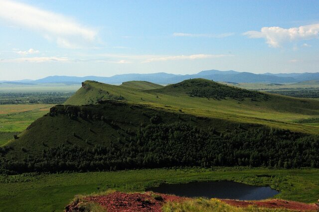 Подтарились в райцентре, заправились до полного (кстати, там самый дорогой газ, что я видел по Хакасии), и двинули в Аскизский район. После Абакана пейзажи начали меняться, горы перешли в холмы и стали ниже. Больше ехали через степи, километров через 40 заехали в Сагайскую степь, именно там следующая точка, одно из священных для хакасов мест, гора Уйтаг.
