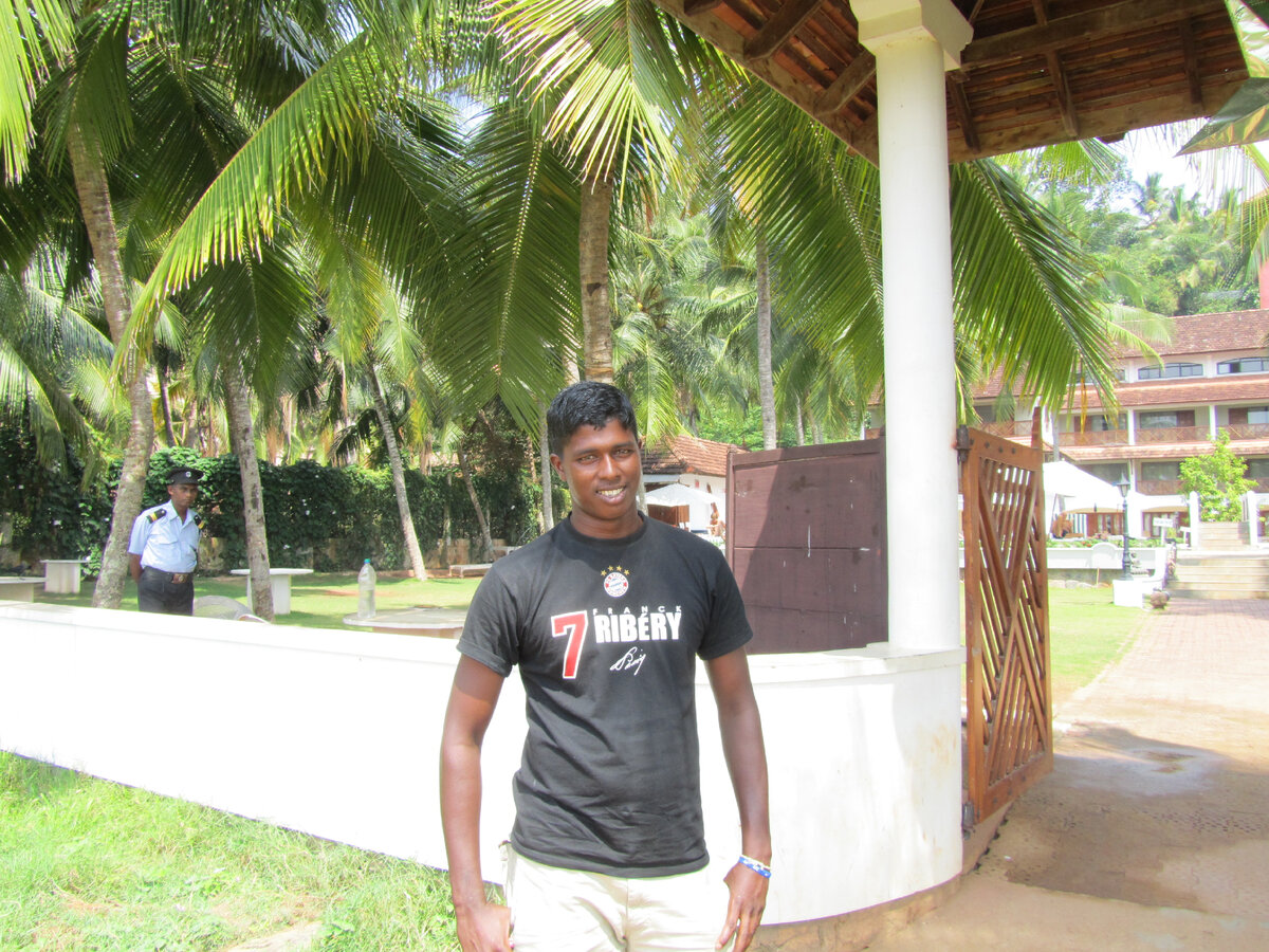 Слоновий заповедник находился поблизости. Большая роща или лес, где слоны содержались в условиях, близких к свободным. Пальм здесь совсем не было. Мы прошли по дорожке через кассу. Я заплатила за сафари (так называлось катание на слонах), а Мартин – за вход. Он провел меня к каким-то домикам между деревьев, где я увидела небольшого молодого слоника, который ел кокосы. Слонов водили низкорослые темнокожие погонщики, с которыми Мартин говорил на местном языке, а мне переводил на английский. Мы увидели семью слонов: маму, папу и двоих слонят-подростков. Погонщики снимали с их ног цепи и вели их гулять и купаться в пруду, который был рядом. Мы наблюдали купание слонят, потом прогулку их большого папы с желтыми бивнями. Мама-слониха работала на сафари.